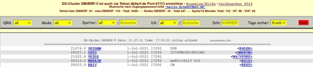 – welcher Funkamateur | zu welcher Zeit | welches Funkrufzeichen | auf welcher Frequenz – (QRV – betriebsbereit) ist | bzw. gehört hat.
